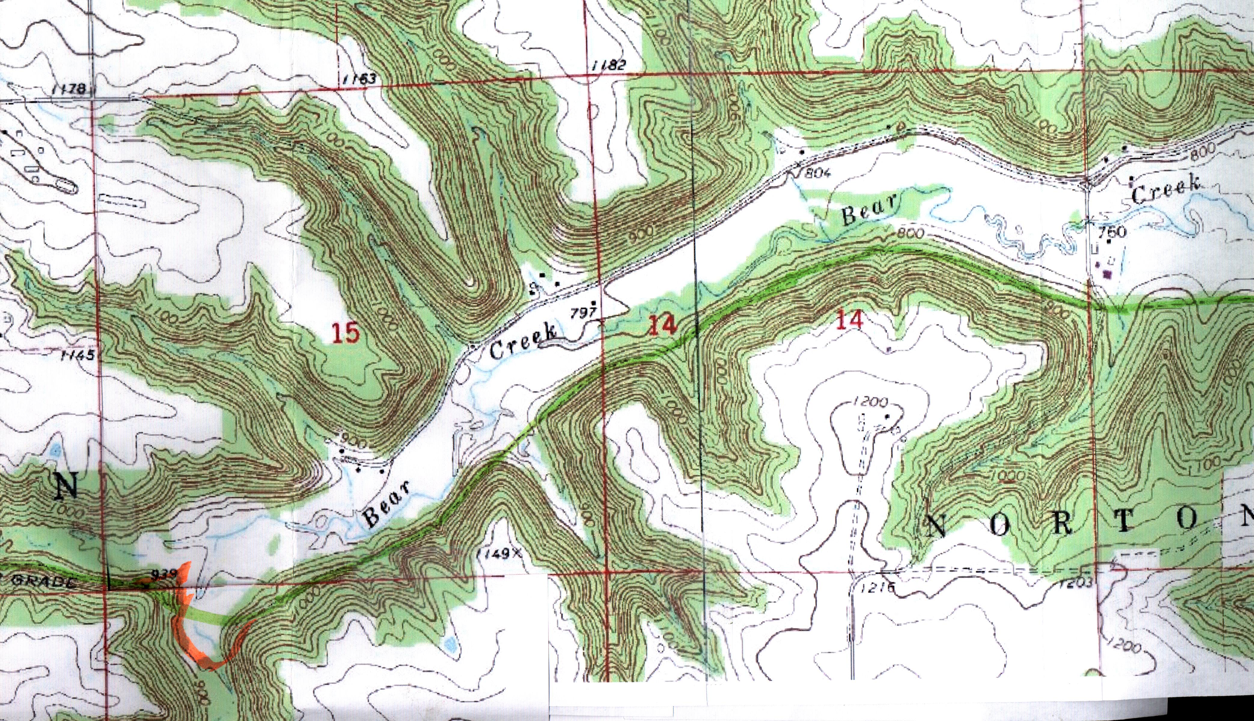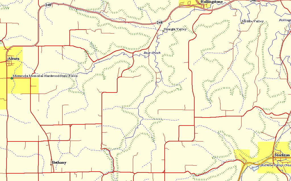 On the trip home we follow the ancient grade of the Chicago Great Western Railroad west from Winona. This railroad grade has been abandoned since 1934, but has always been fascinating. It had very steep grades, and something you don't see in Minnesota - switchbacks! There wasn't much left to see from public roads - the trestles and other items were long gone. However, the old grade was visible through the trees across the valley from the public road, and we could see hunters were using it during the fall hunt. Click for an overview map (109k), map 1 (1.5m), map 2 (1.4m) and map 3 (1.1m) of the area.
